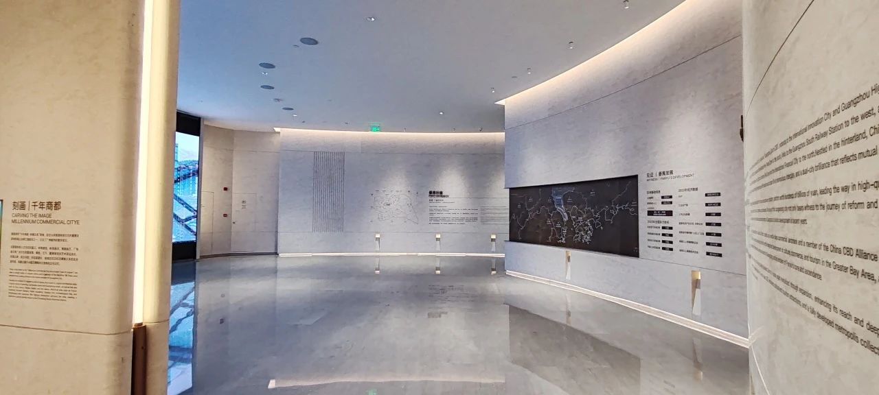 同時也設有精心設計的圖文展示墻,詳細記錄了長隆萬博片區的發展歷程和未來規劃,從萬博片區到項目自身,層層遞進,即使非廣州本地人也能迅速了解板塊情況。從一樓,可以清晰看到番禺的發展,看到萬博CBD從1.0到3.0的一路進化與迭代。從2006年萬博商務區概念面世,再到2013年控規獲批,直至2023年完成擴容。擴容后的萬博商務區,由1.5平方公里擴展至7.2平方公里,涵蓋漢溪長隆、萬博、里仁洞三大板塊,并統稱為“廣州南CBD”。360°沉浸式影廳,給大家描繪萬博未來城市的生活方式。