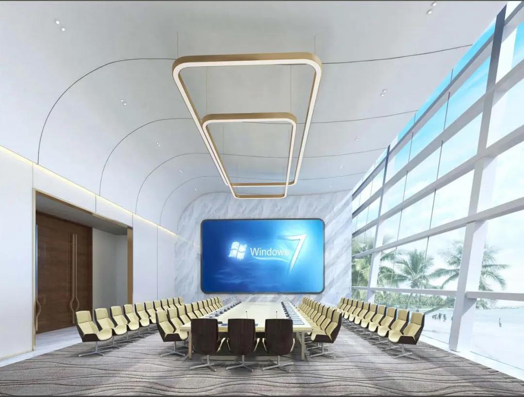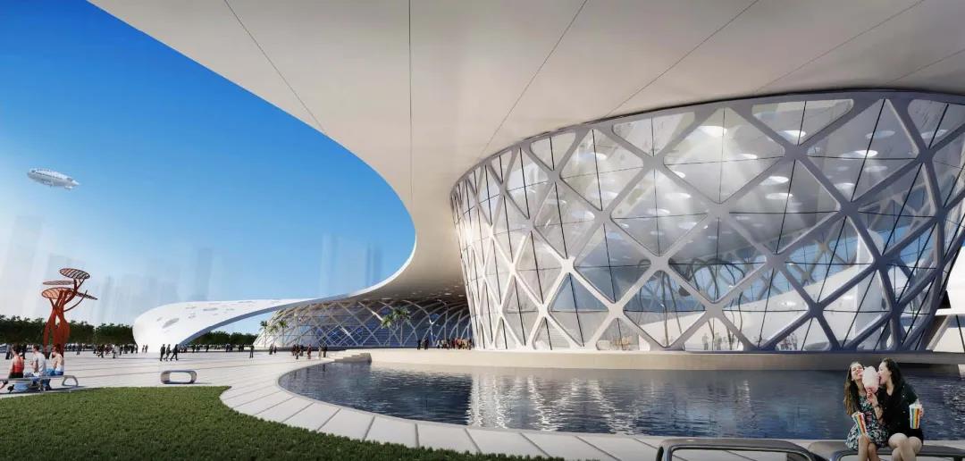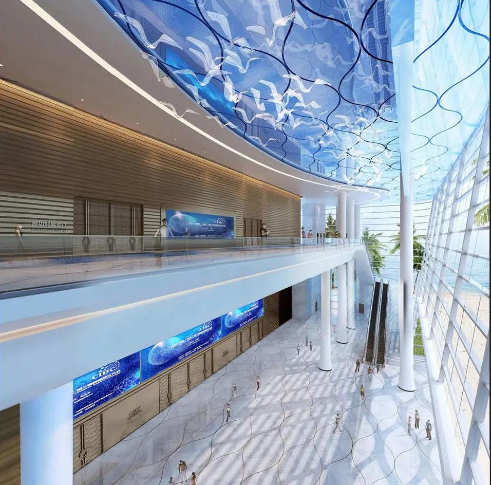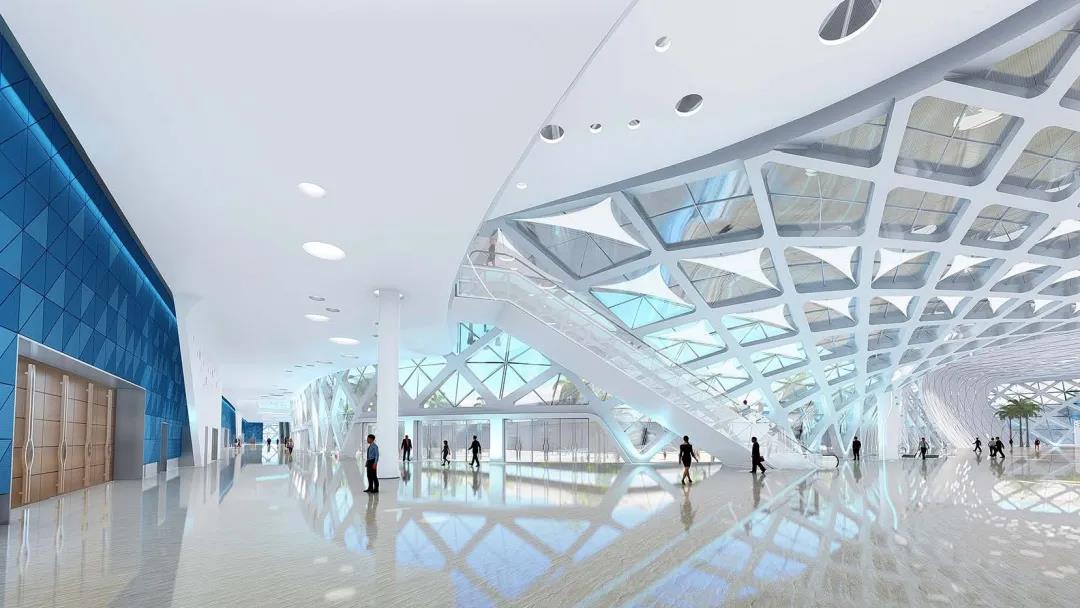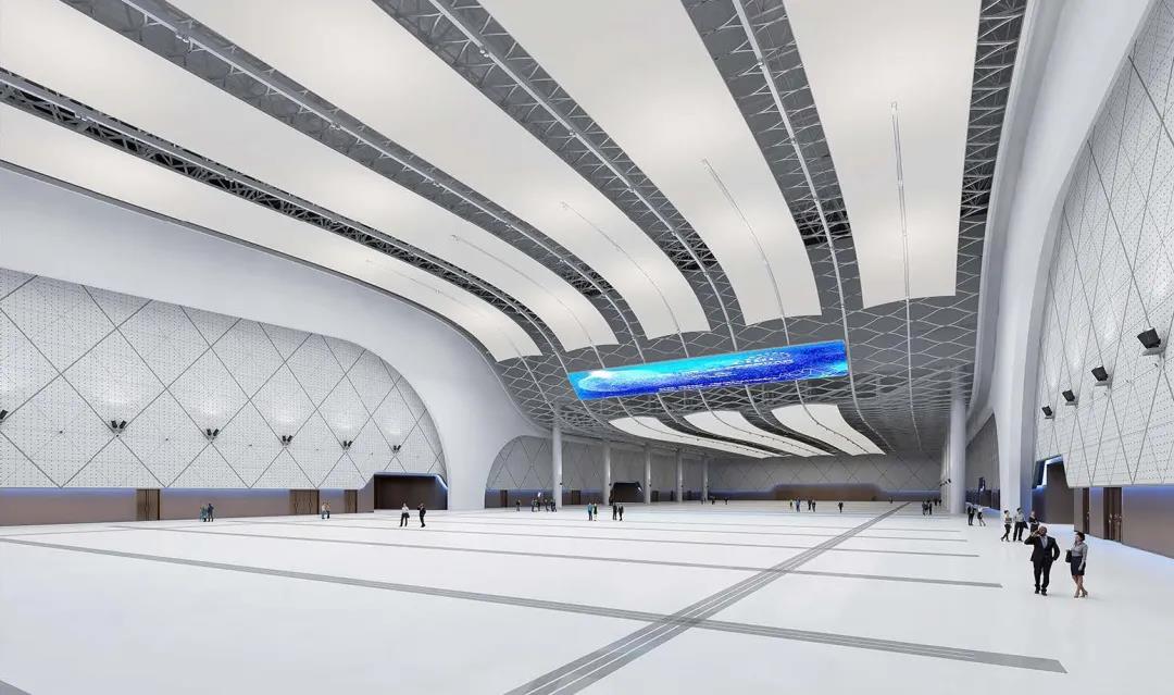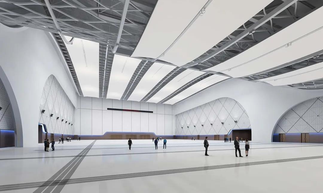 展覽大廳設計充分利用空間的特征,將兩層巨大的落差變成一個最大特色且和建筑元素相呼應,以兩翼將高和低空間分成兩個區域。天花板采用反光膜為空間的主要照明,節省了空間的能耗,并帶來柔和的主光源。膜天花又像飛翔的翅膀,和建筑飛翔的海鷗形態相呼應,墻面、天花嚴格按聲學要求設計。巨型的室內空間能有較好的影音效果,整個場景可以滿足高端展示,萬人會議和一些重大活動及演出秀的多重功能。