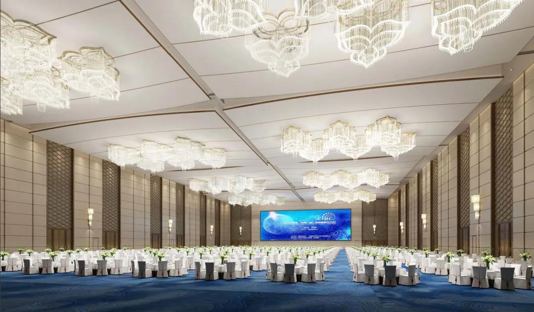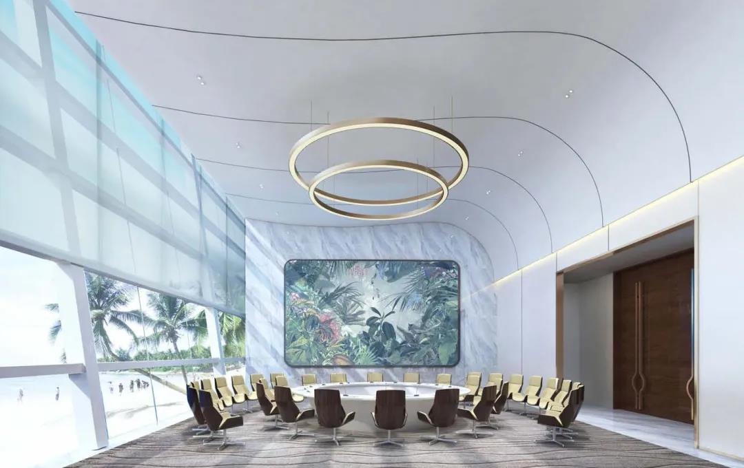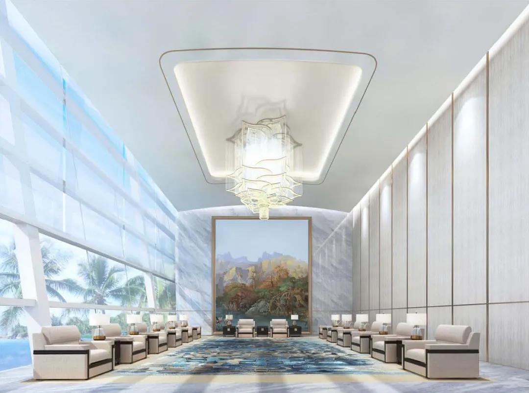 4000多平米的多功能宴會廳設計,強調其滿足不同功能的專業性和品質感,尤其作為宴會的氛圍。以揚帆起航騰飛的主題,天花由八塊四組飛翔意向的天花造型組成,將海南省花“三角梅”藝術燈飾作為宴會廳的天花構成。地毯以海為主題,使揚帆起航的內涵和主題做一個具有視覺沖擊力的表達。主宴會廳設一個300多平米的單個巨幅屏幕,在會議、宴會及婚宴、表演都能有一個具有視覺互動的主背景。
