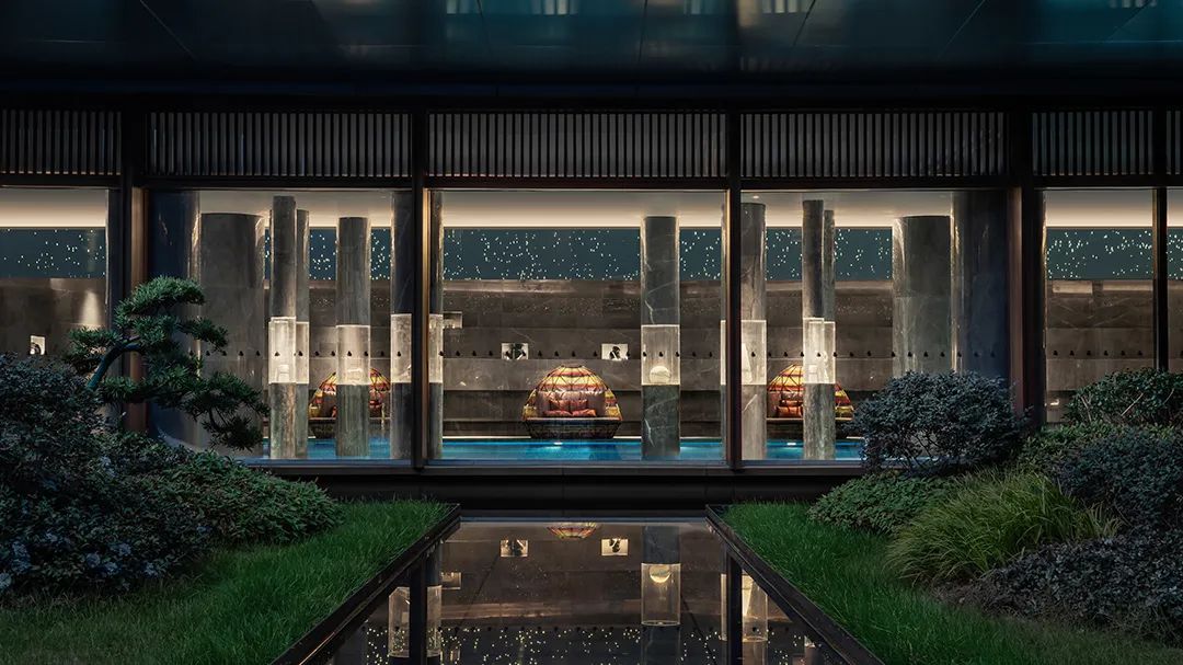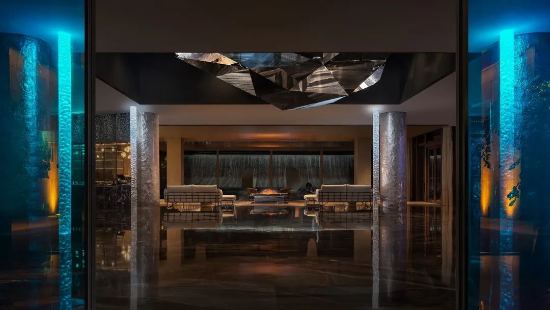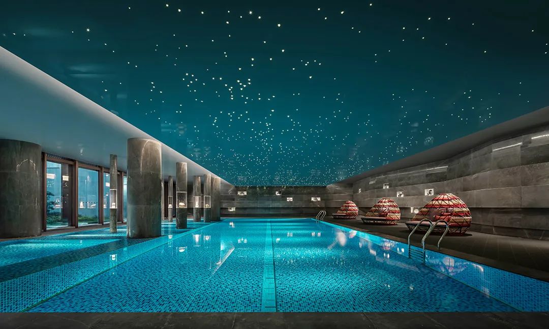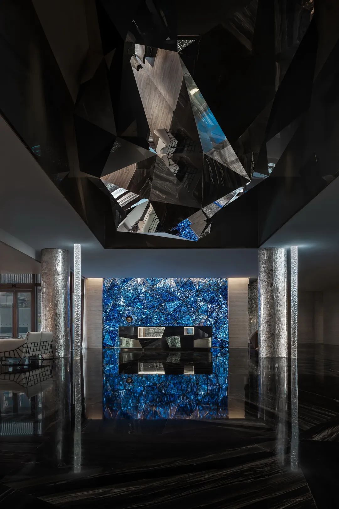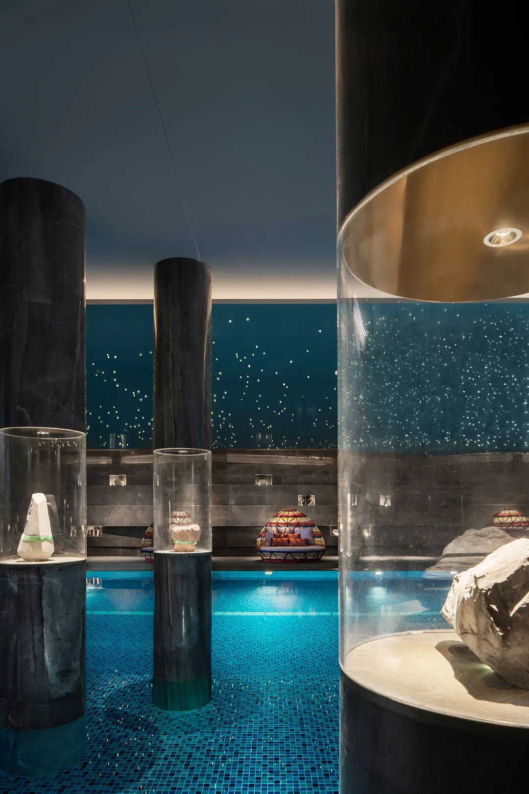就連泳池,也懸垂銀河天象,珍藏著不同地質(zhì)年代的礦物標本。層層堆疊的地幔環(huán)繞,如置身幽深礦谷。星光傾瀉,鑿空這片深邃的昏暗。