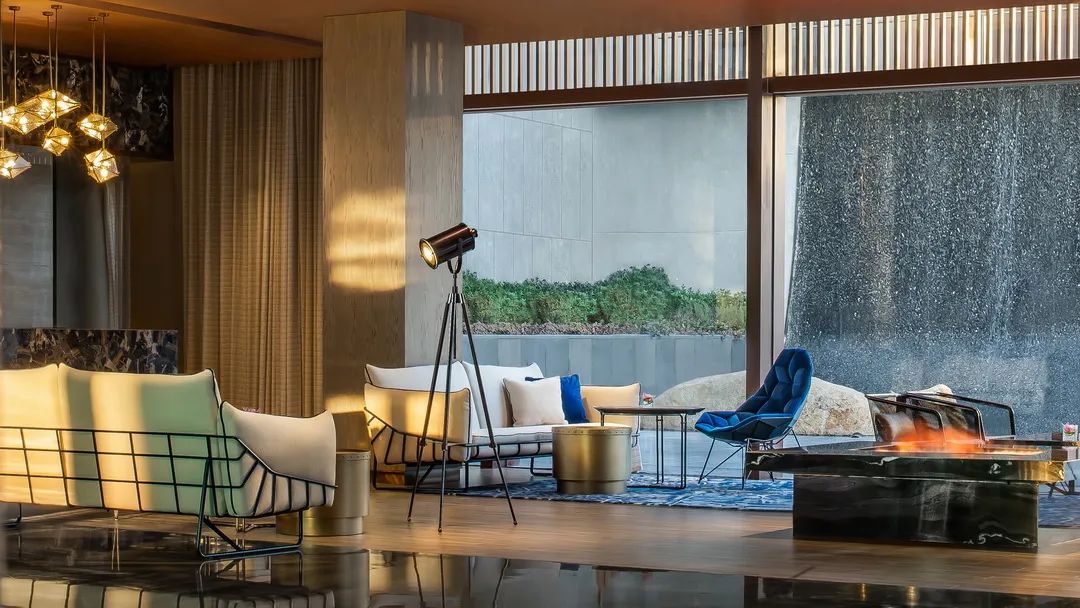 相比冷峻迷幻的大堂空間,YANG為大堂吧賦予了更多的溫情。棕褐木質(zhì)地面、象牙白暗紋呢沙發(fā)、復(fù)古暖光的垂吊礦燈……熊熊熾熱的篝火,暈出黃昏的朦朧輪廓。窗外水簾慵懶地哼吟石間,歲月緩緩沉淀,邀你慢下來。