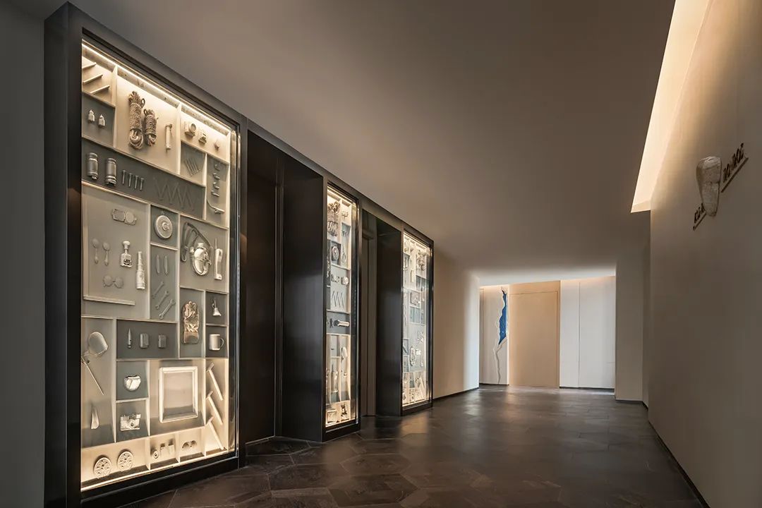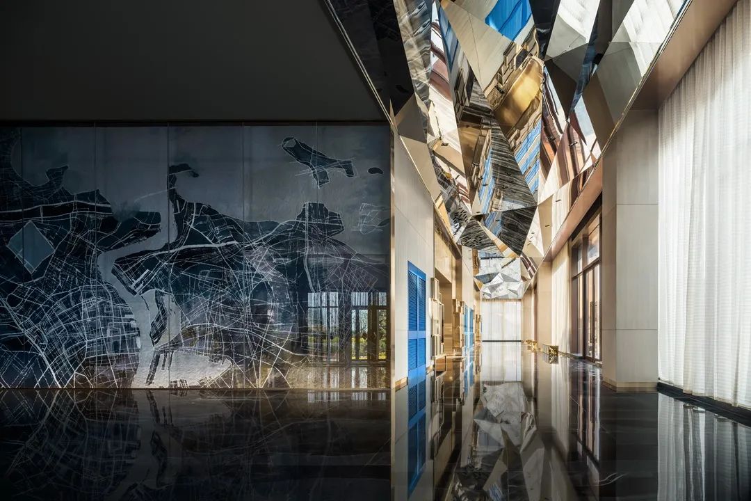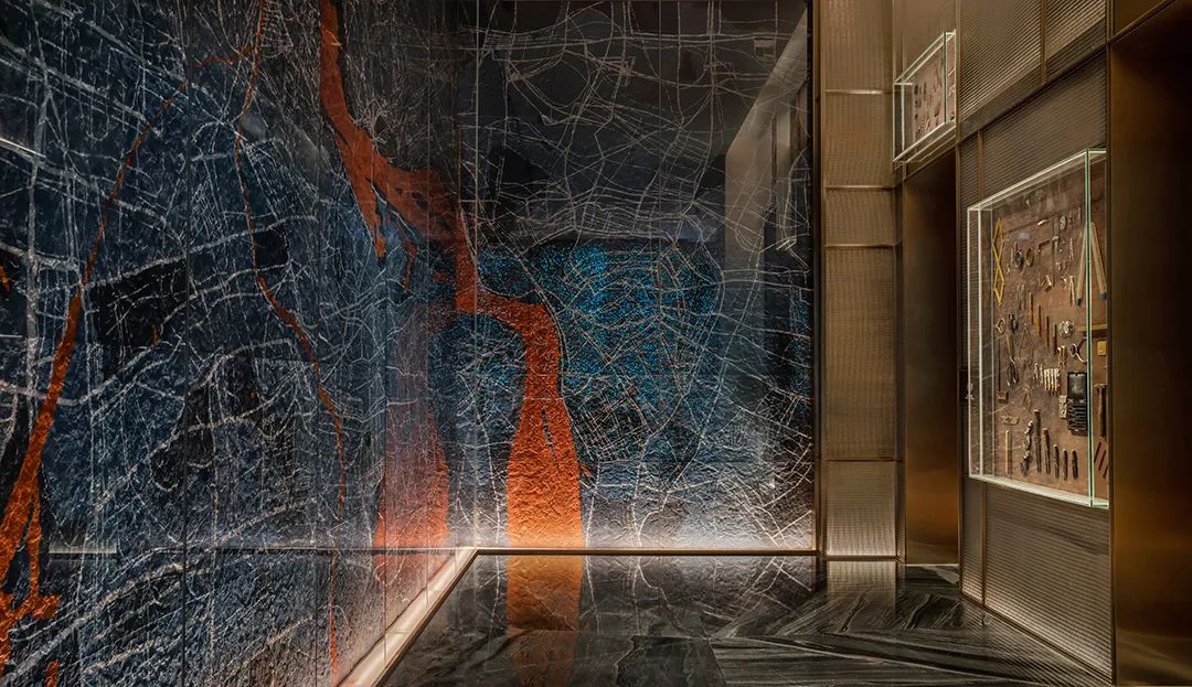 當大地側(cè)了個身,將山河走向、地質(zhì)肌理坦露于墻,送來城市生長變遷的信息,你會不自覺沉迷靜思。常規(guī)的宴會電梯廳前,YANG別出心裁引入地形圖譜,激發(fā)驚喜。