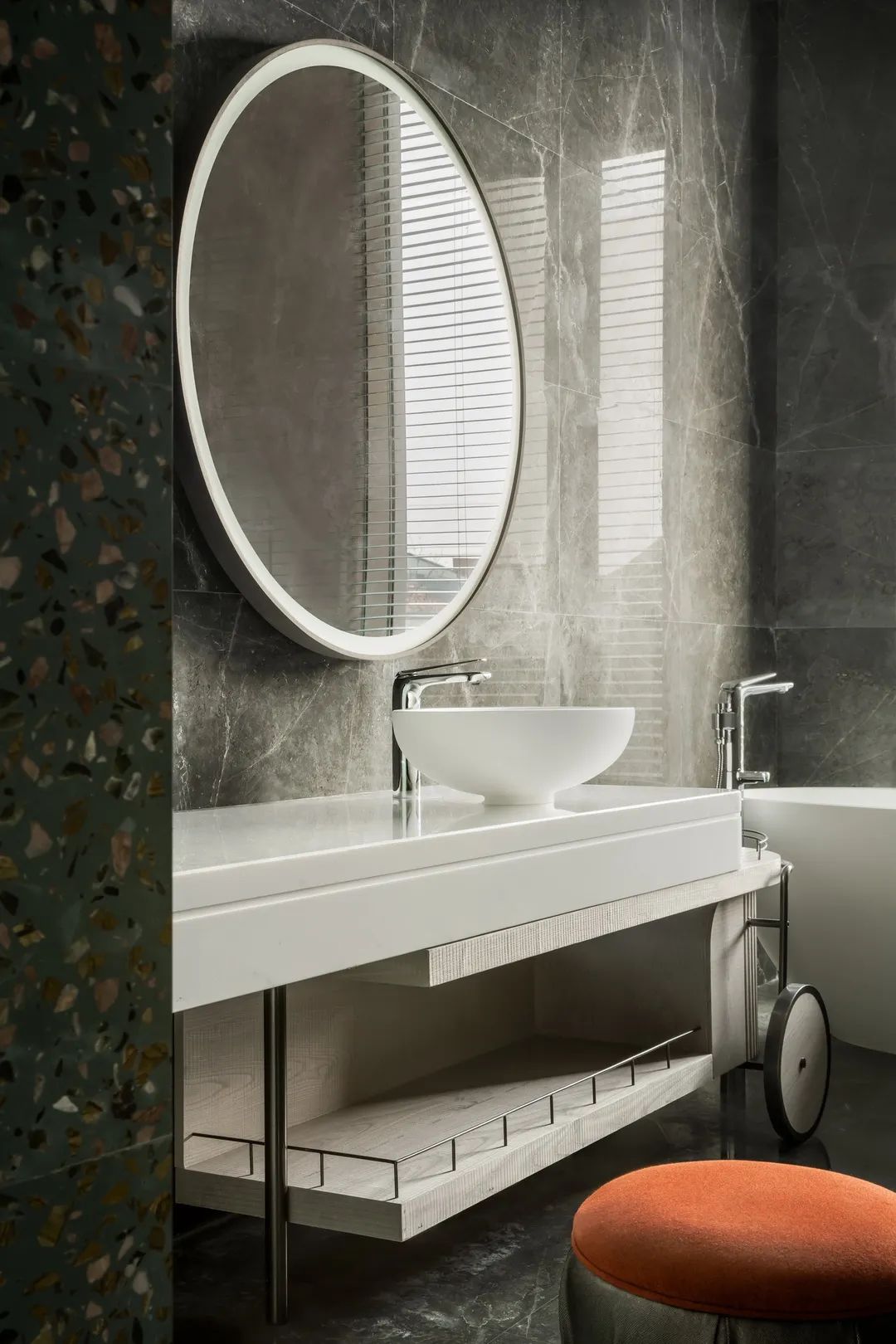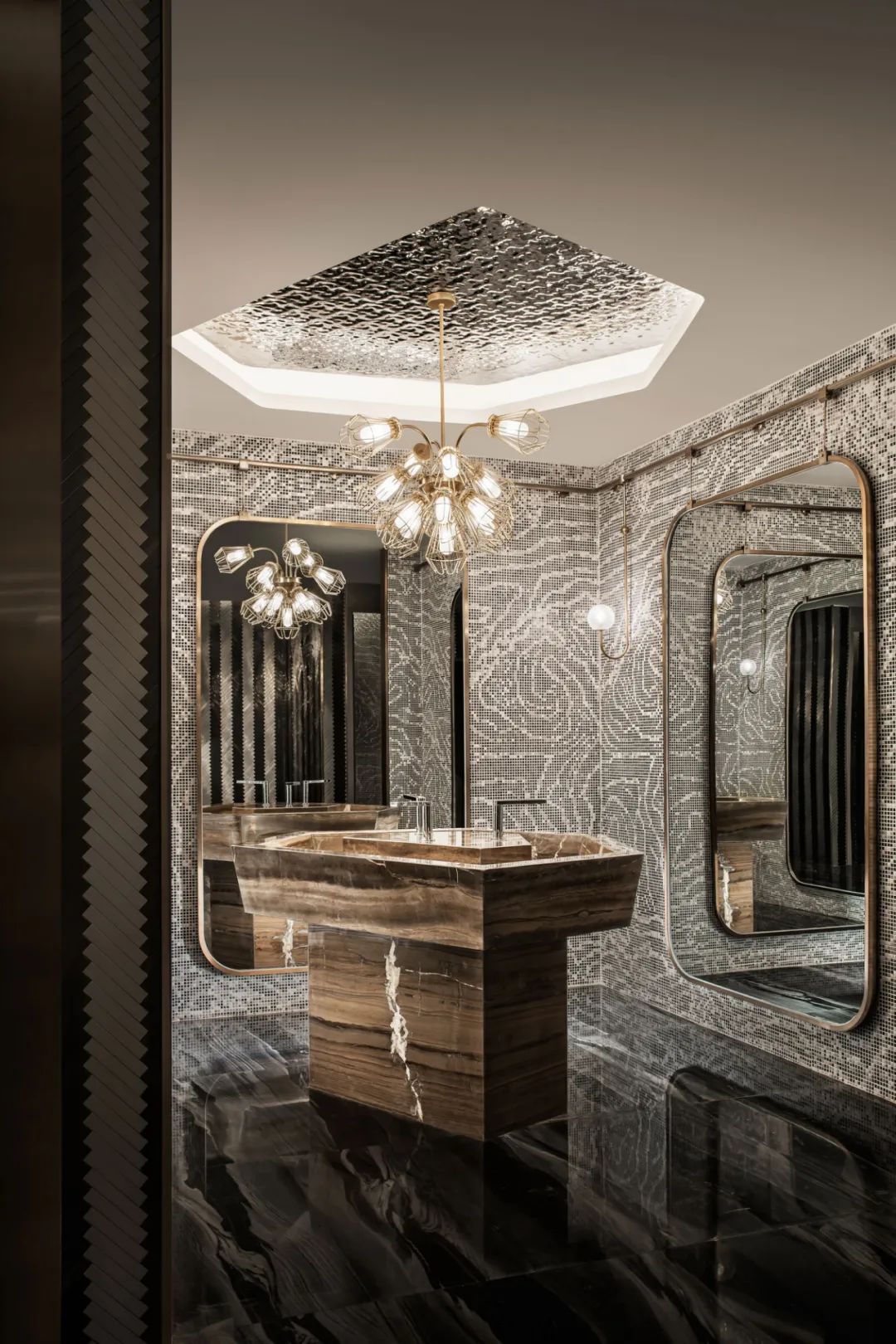 礦巖結(jié)構(gòu)的洗手臺、地形紋理的馬賽克墻設(shè)計連續(xù)且細密