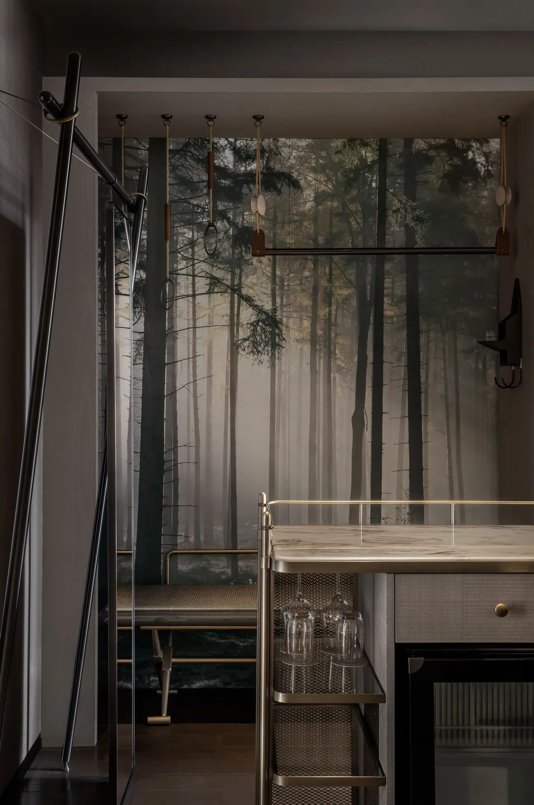 門前剝裂的巖石層,是地球傷口的隱喻。蔥綠侵染的城市地貌、青苔綴連的地毯、植被盛開的抱枕、森林氤氳的衣帽間……預(yù)演著礦野新生。礦物工具箱化身迷你吧、床頭柜,滿載湯山鄰里的往事。