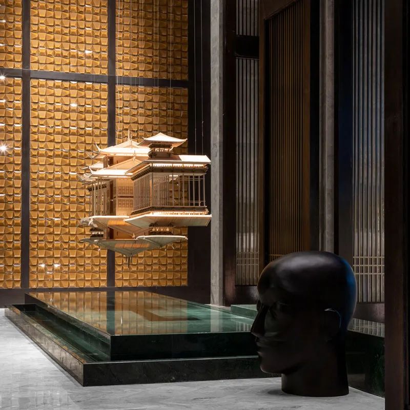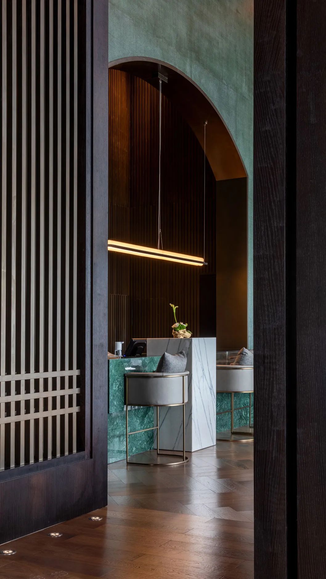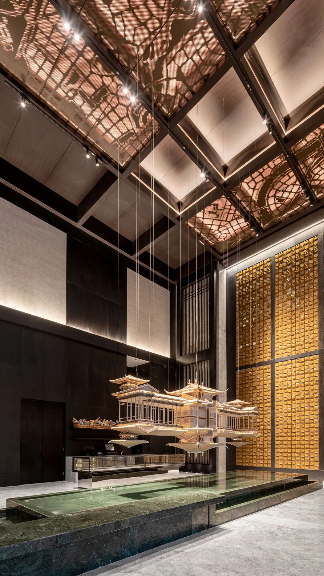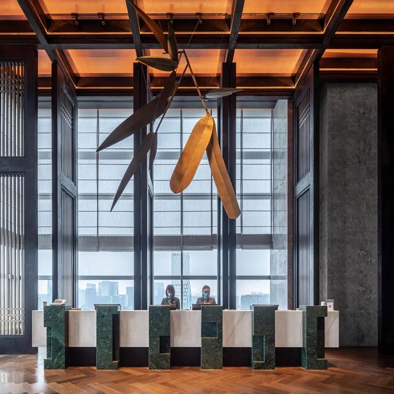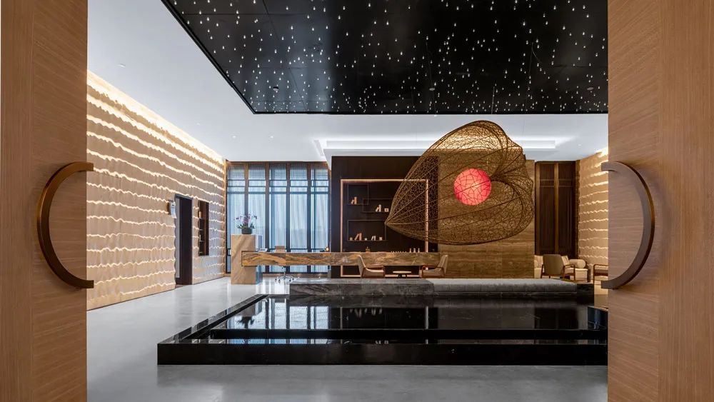 酒店采用獨(dú)特的雙大堂設(shè)計(jì),首層大堂以“胡同”為主題,連接著世外桃源和別有洞天的謐境,穿過高高的木扇門,9m的高空星羅棋布的星光繪制成蓉城的地圖,天地交融韻味獨(dú)特,貼心的地暖設(shè)計(jì)讓溫度和濕度都仿佛置身桃花園中溫暖的家。