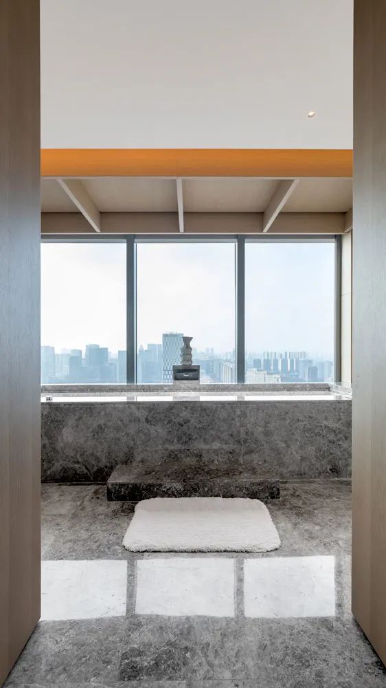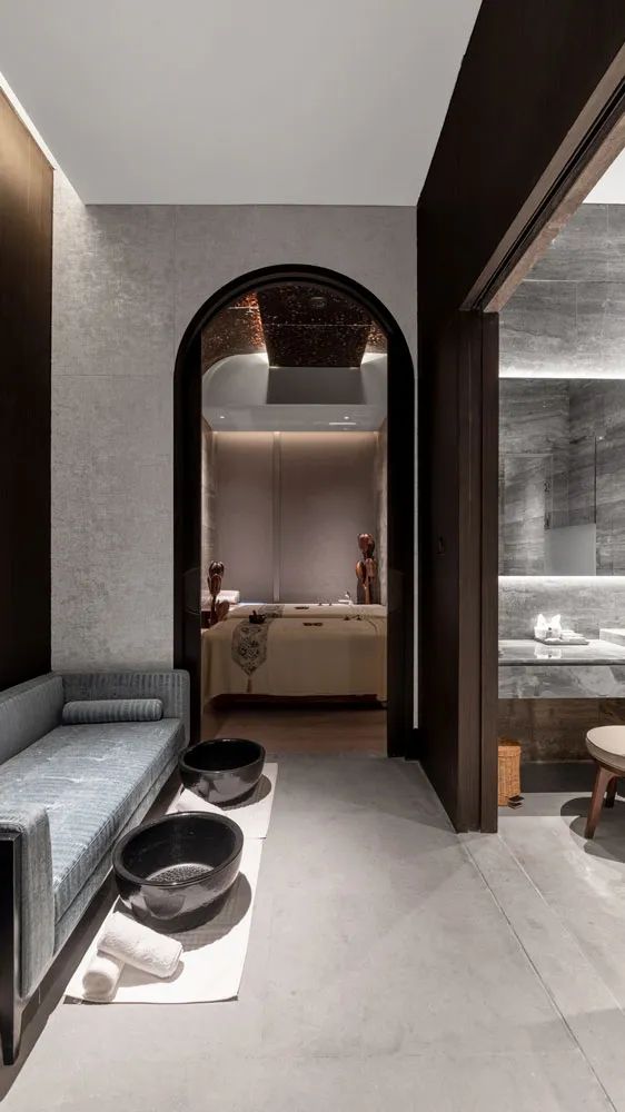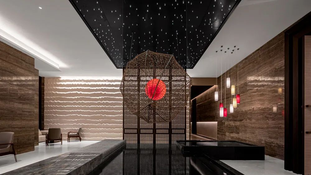 位于18層的養(yǎng)生中心以“庭院下溫暖的夜光”為靈感,在600㎡的空間中將山之自然,水之靜謐化作空間意境,300㎡的云端無邊際恒溫泳池讓賓客仿佛置身于“雨下的庭院”。