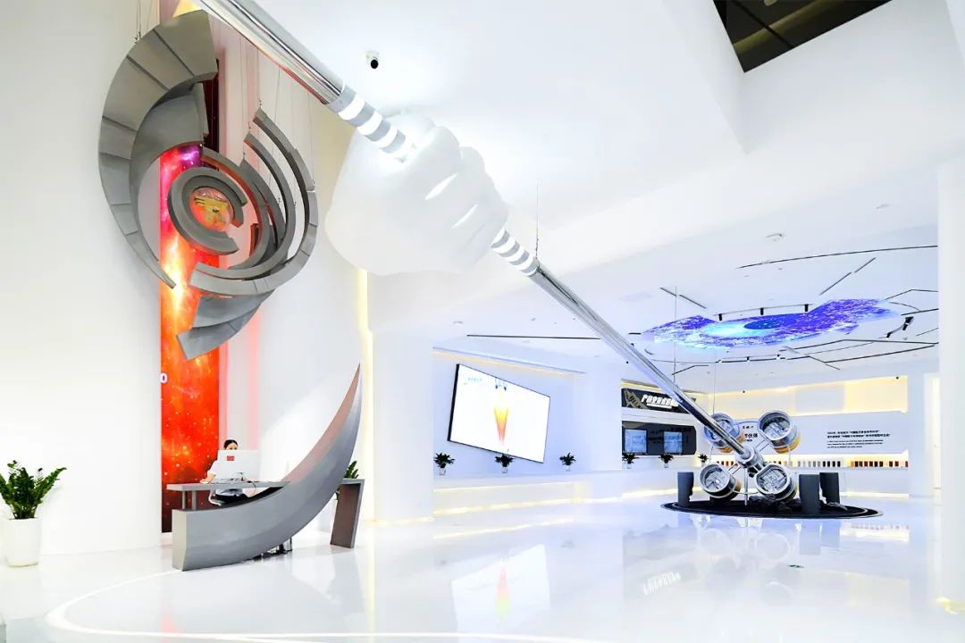 進入展廳,一道紅光閃爍-鳳翅和鳴映入你的眼簾 ,造型靈感來源于鳳凰羽毛跟鳳凰之眼,向右順勢看去,一只強有力的拳頭(凱撒大帝之手)從天花伸出,延生過去就是神六之光,3個概念裝置,全部用鋁材制作,造型復雜,既要保證效果也要考慮安裝跟連接的牢固性,技術及安裝難度很大。項目部在施工現場一次又一次地嘗試,不斷調整,確保不出絲毫偏差。
