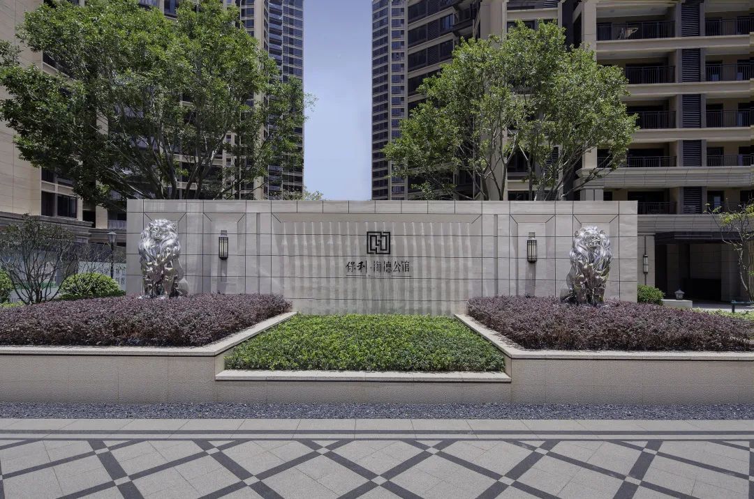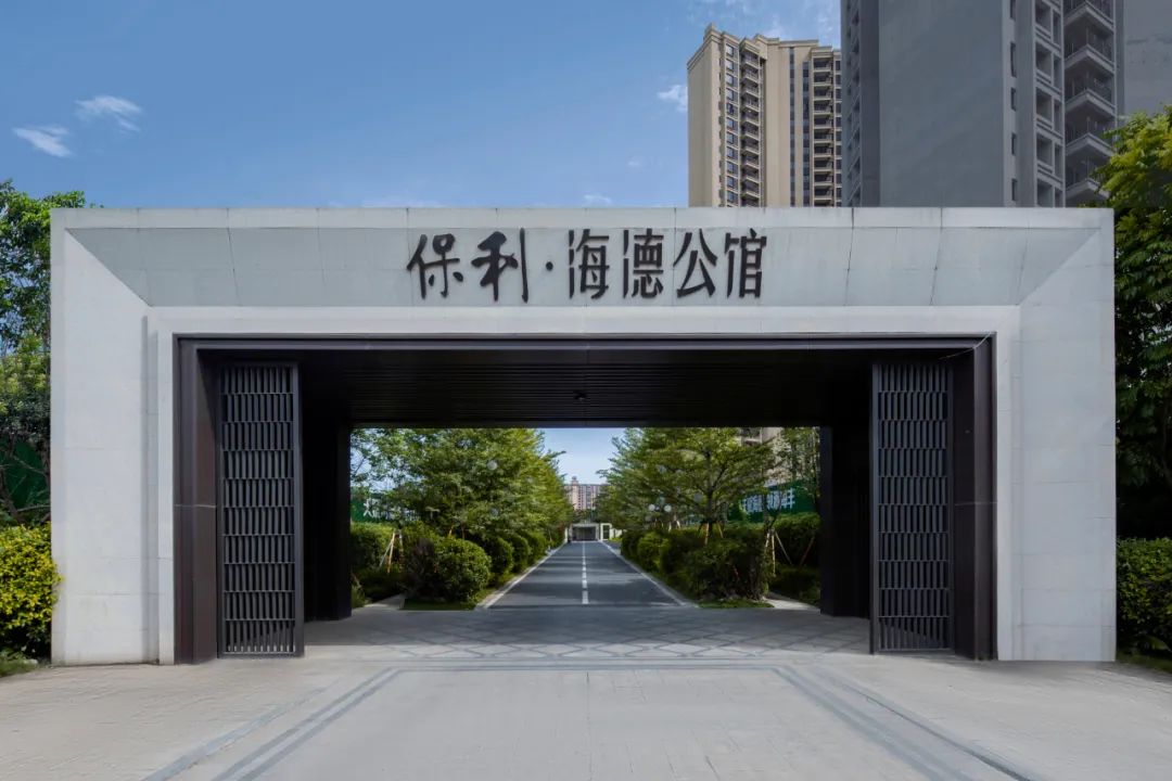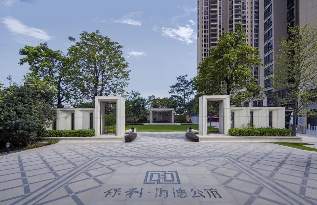 初見海德公館,簡約典雅的迎賓門,是歸家最初的印象,一旁跌落的水景與草坪空間盡顯大宅品質,入口中軸對稱,樹陣迎賓,讓歸家的儀式感達到至高點。