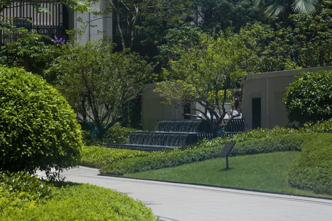 過入口,結合場地高差,設計巧妙利用階梯和整形樹池將禮序延續,階梯消化高差的同時,也為園區增添了神秘感以及歸家的尊享品質感。