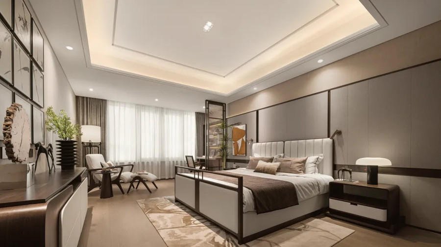 老人的睡眠空間傳承了從建筑中來的中式留白意境,雅致沉穩的棕調構建出具有東方氣質的禪意之所,適度留白傳遞長者淡雅從容的生活品味,在飽滿的間距式照明光影的交織中,勾畫出一間具有多重維度體驗的就寢空間。