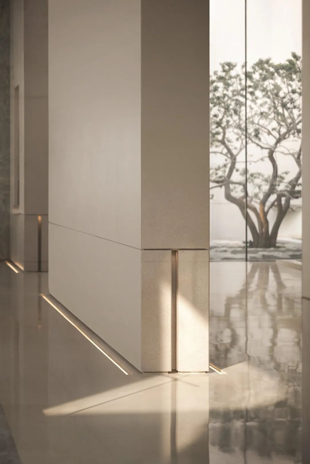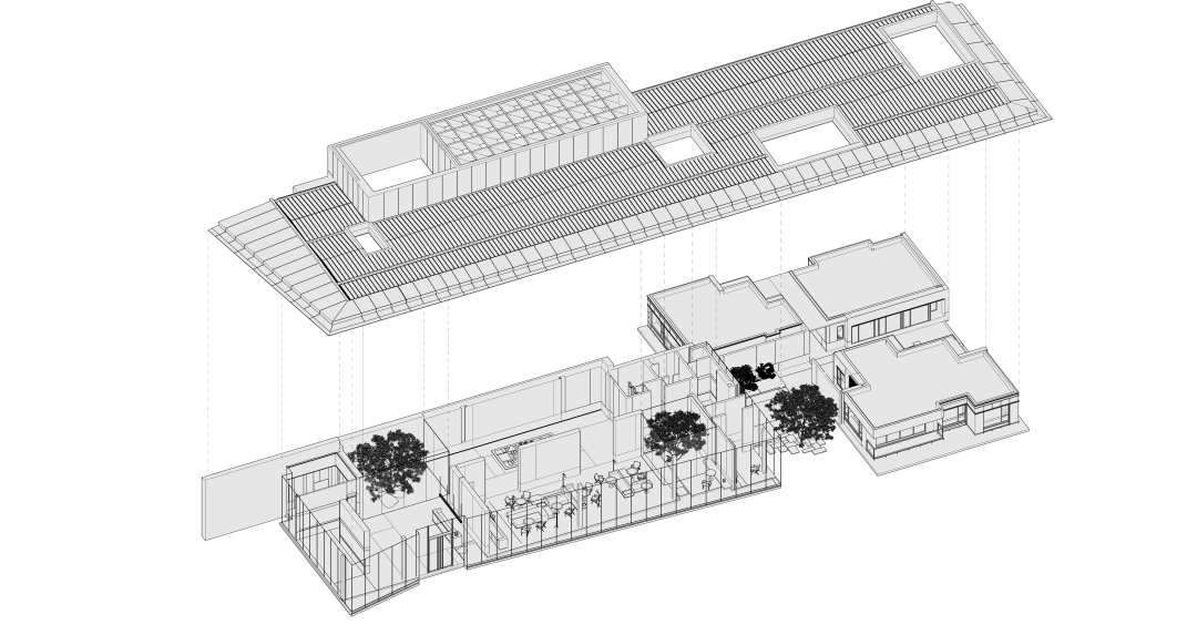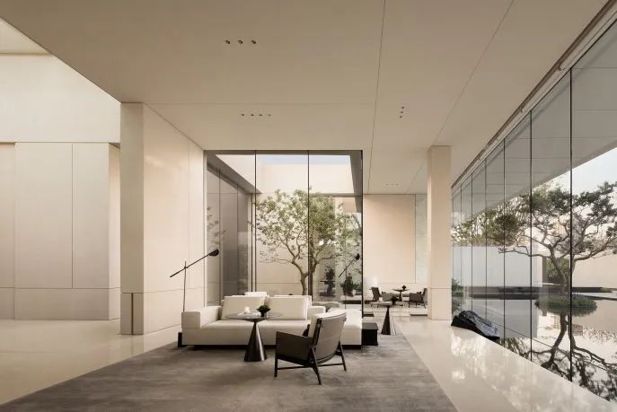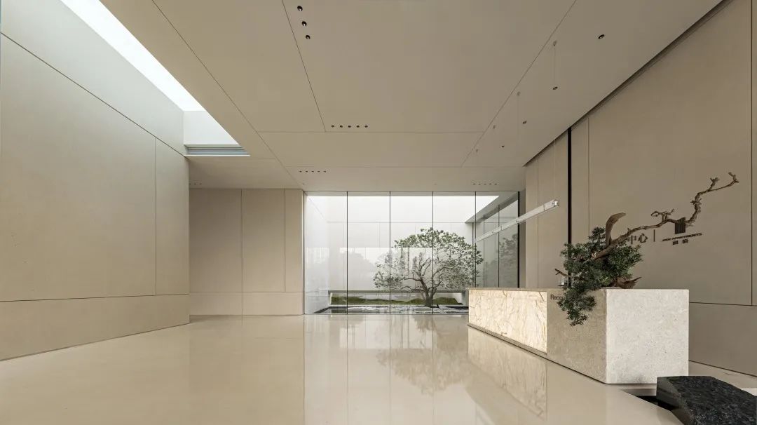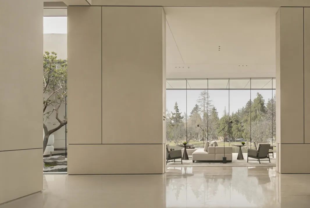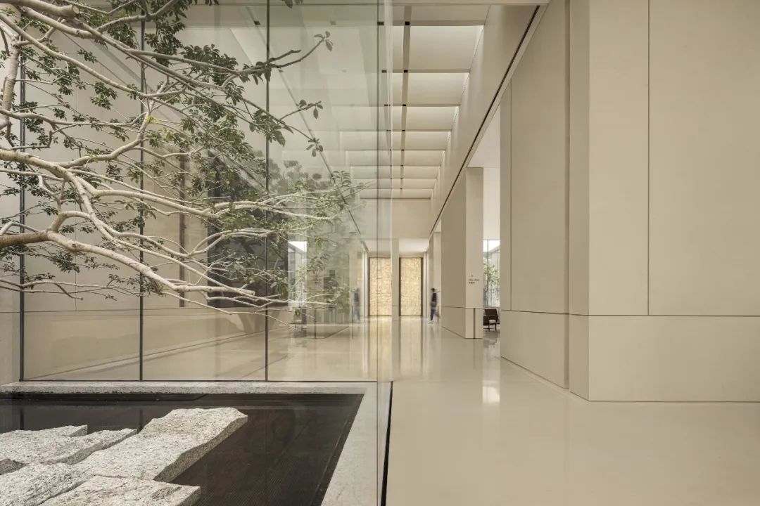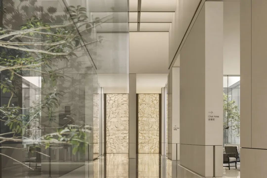 在這個空間中設(shè)計團(tuán)隊(duì)同樣運(yùn)用了這樣的空間表達(dá)手法,在室內(nèi)向外望去,也並非是原先的景色,規(guī)整的長方形像是畫卷的邊框,樹的生長、光影遷移、人的來去令它的內(nèi)容時刻流動變換,或清寂、或繁鬧......