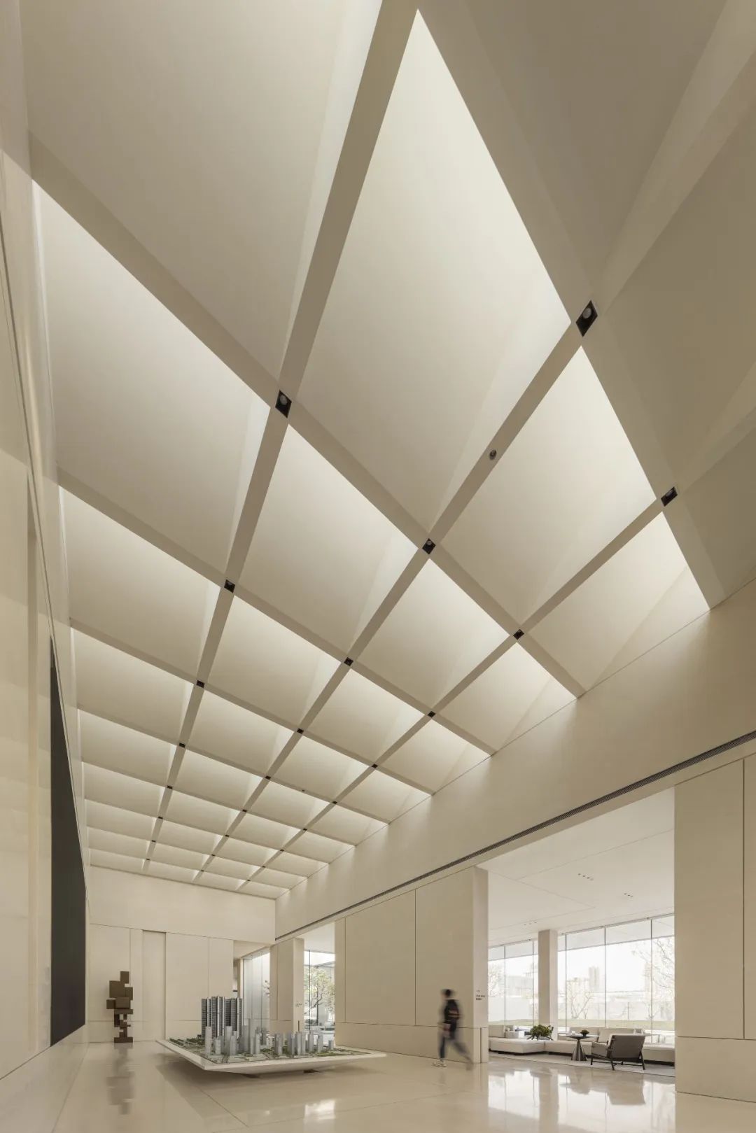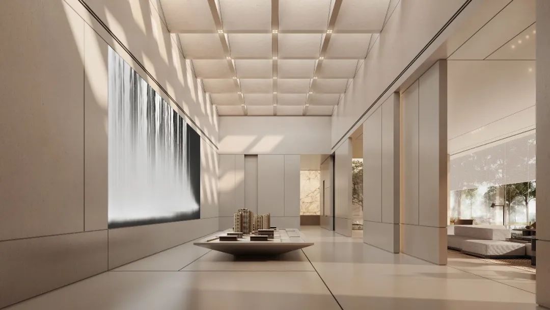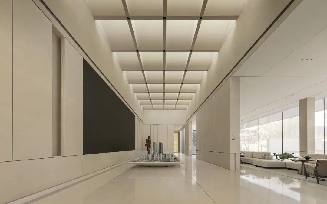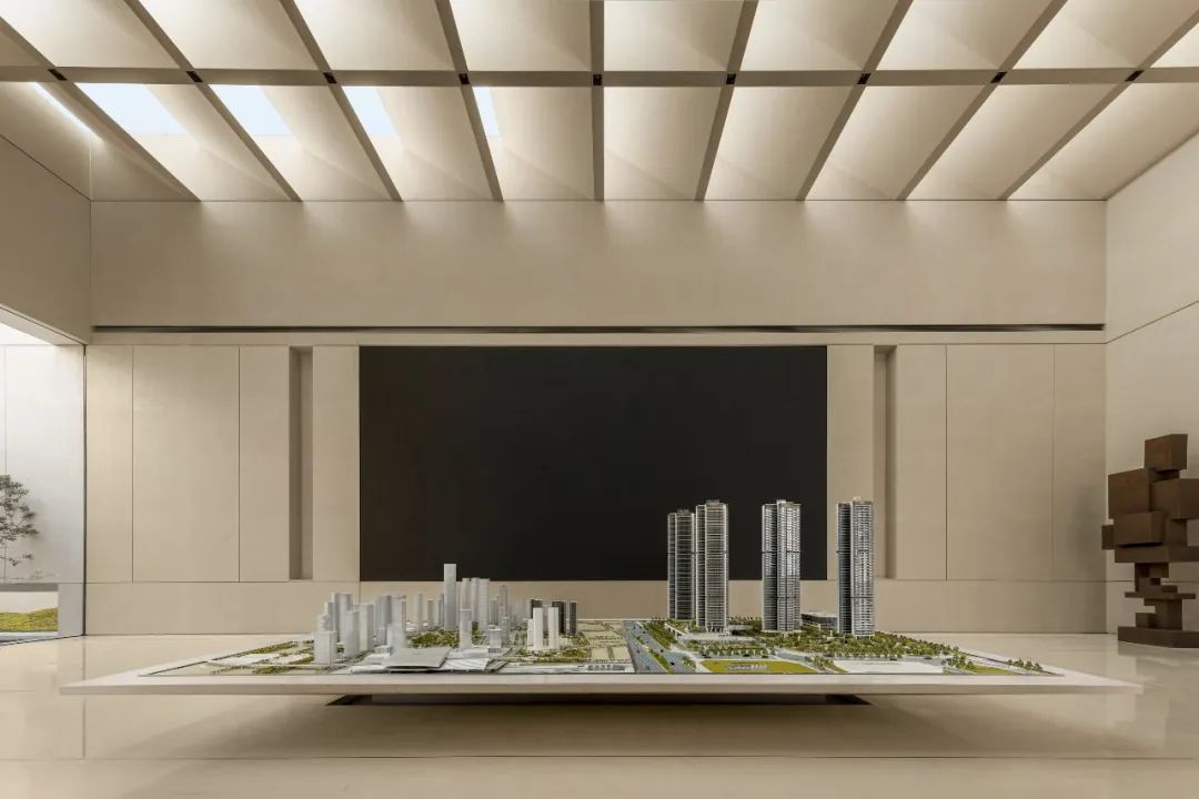模型區(qū)天花一反原始嚴(yán)整斬齊的封頂構(gòu)築,通過結(jié)構(gòu)重塑與角度調(diào)整,打造大型橫斷格柵,使太陽顯現(xiàn)出別樣的形態(tài),實(shí)現(xiàn)日光在室內(nèi)的自然傾瀉與光影變幻。