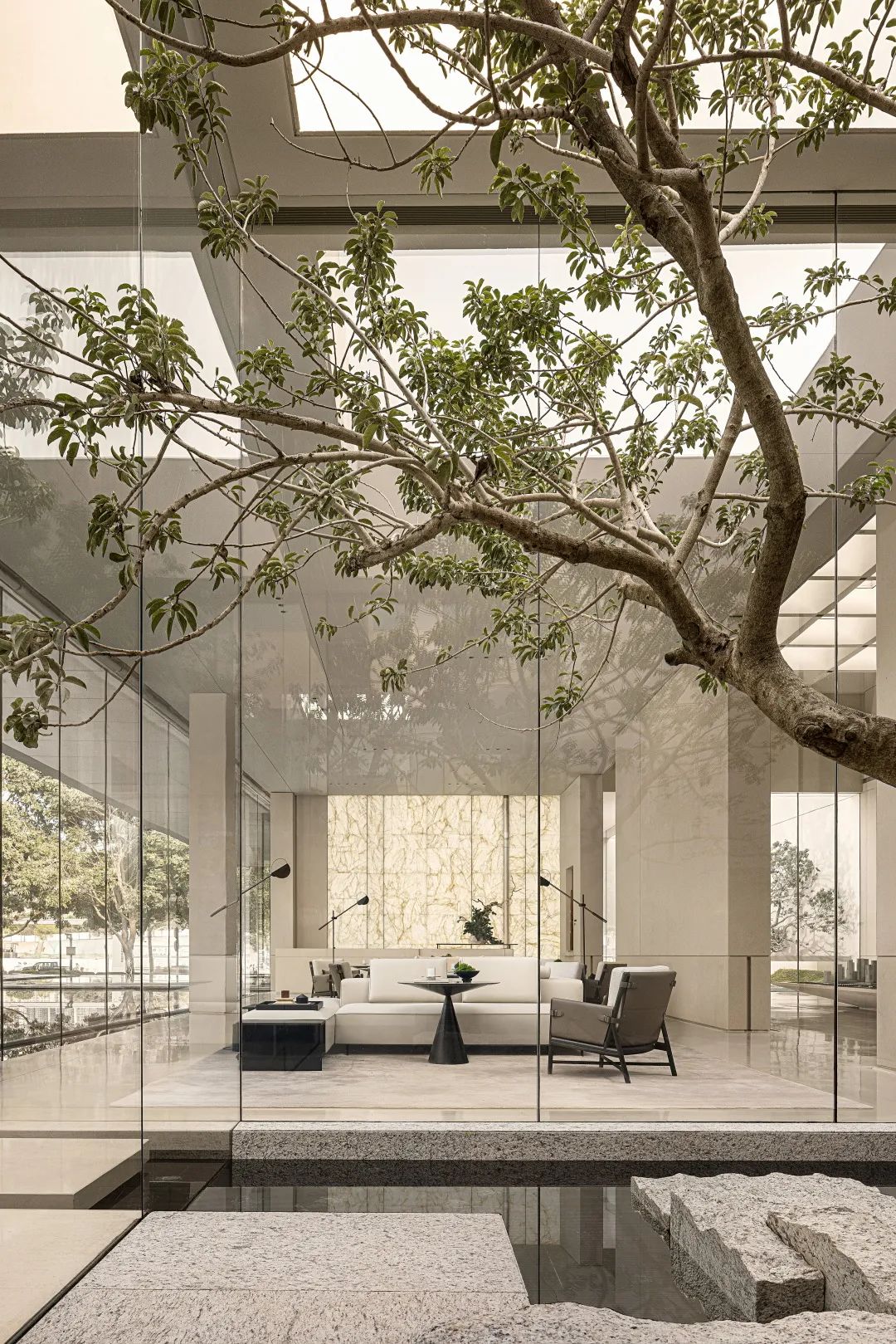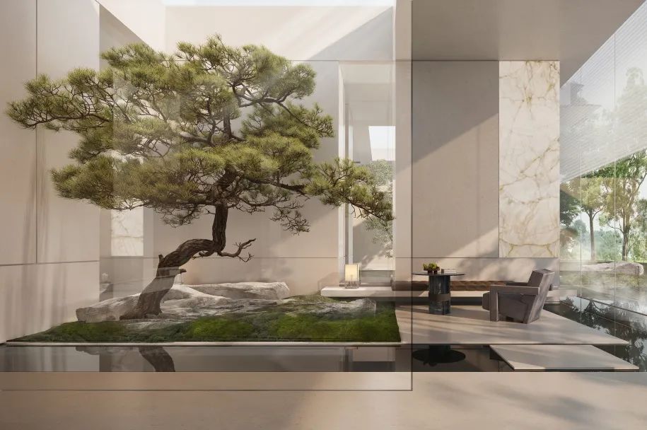 而作為東方建築美學(xué)代表之一的蘇州園林,則為空間的內(nèi)部提供了有關(guān)人與自然和諧共生的別樣色彩。山水意象的組合在東方文化中有著極大的佔(zhàn)比,流動的水給予人柔軟清涼的觸感,枝幹鮮明的樹則打造了堅韌的自由形態(tài),剛?cè)醽K濟(jì),陰陽調(diào)和,和諧表面下映射的是東方古典的高情遠(yuǎn)韻。