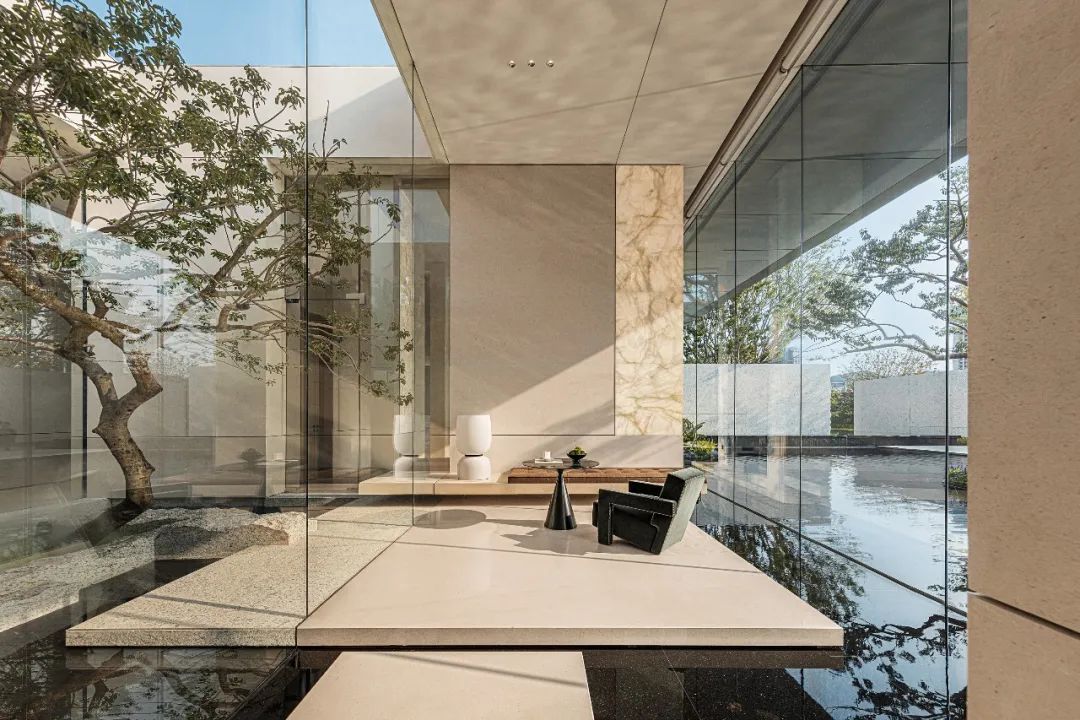 在這個空間下人的活動不僅局限於社交,同時還囊括由庭院的簡約山水帶來的生活體驗(yàn),從起皺水面、搖動樹梢中放慢生活的節(jié)奏,細(xì)細(xì)品味天光雲(yún)影的曖昧。