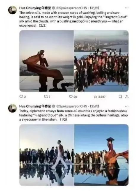 2024年1月4號“外交官看中國?廣東行”活動一行來到廣東省深圳市,近40個國家的駐華使節走進前海合作區,了解深港兩地在口岸交通、科創合作等領域的深度融合,感受前海在推進深港融合、賦能粵港澳大灣區高質量發展中的作用及成果。并在深超總部深灣屋頂國際會客廳觀“天空之境”觀看了一場非遺文化”香云紗“時尚秀,引來了外交部部長助理、發言人華春瑩的點贊,“身處繁華都市云間賞‘香云’紗,這是一種怎樣的體驗!”
